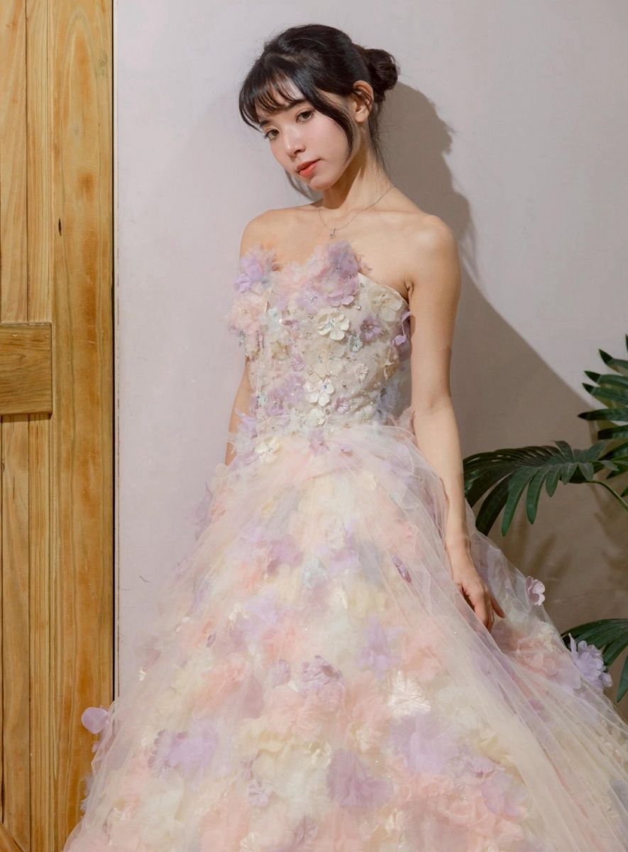 以柔和的裸膚色或淺鵝黃為底色,裙身上滿滿地灑滿了粉、紫、嫩黃等多色手工立體花朵。這些花朵並非平面刺繡,而是真的有層次感地綻放於裙襬上,感覺直接把春天穿在身上,根本就是從花園走出來的仙子!