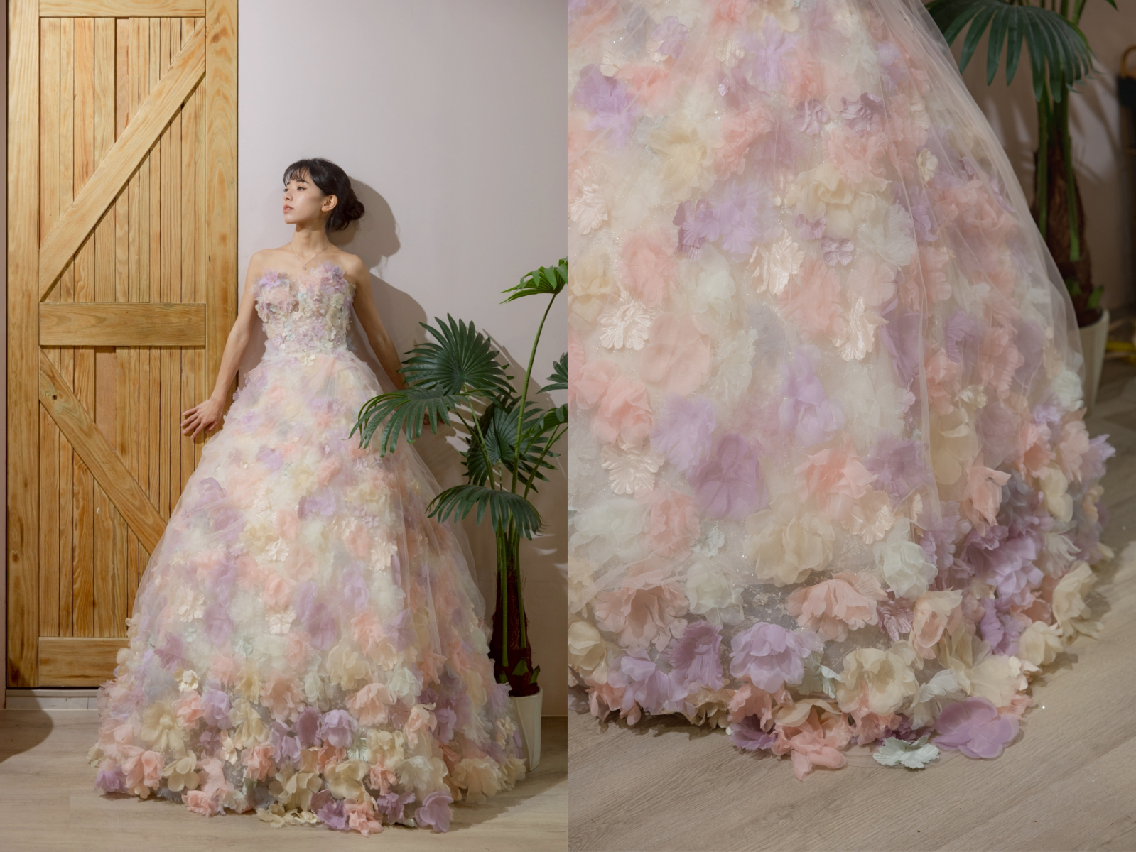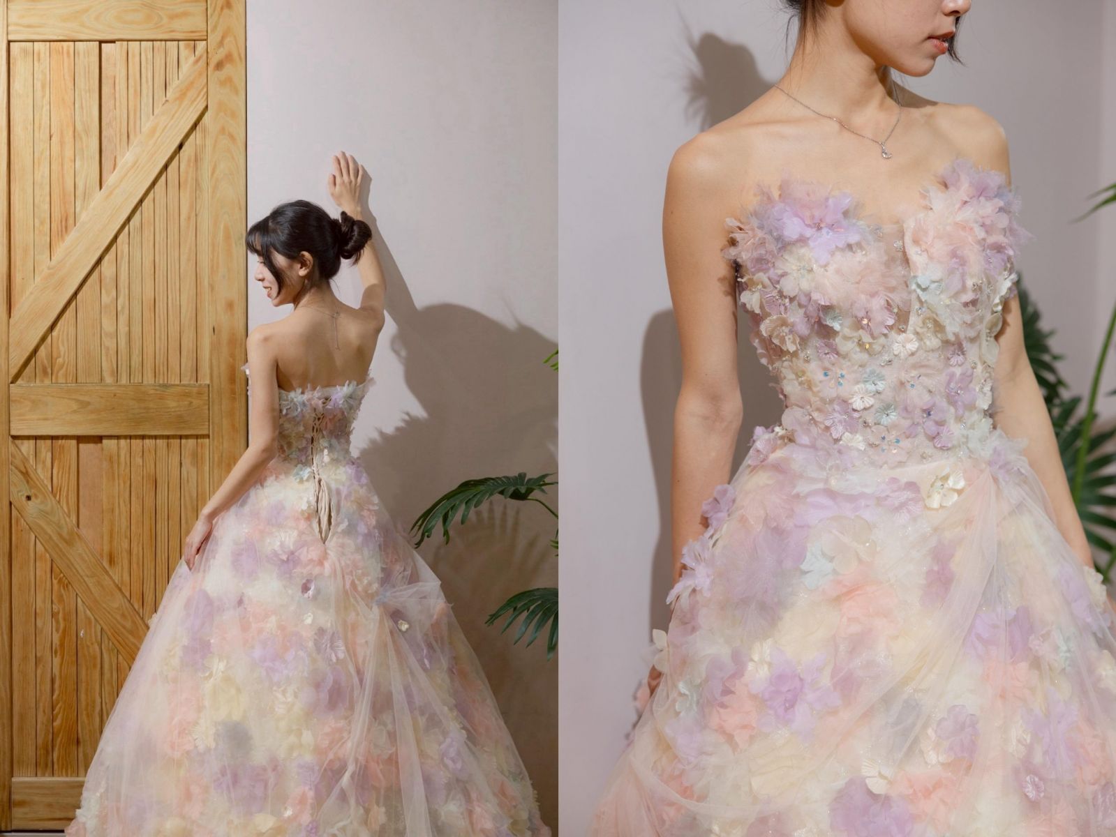 這是晚禮服系列中,最讓我少女心噴發的一款!它完全打破了傳統對於禮服色彩的限制,帶來一股充滿生命力的療癒氣息。