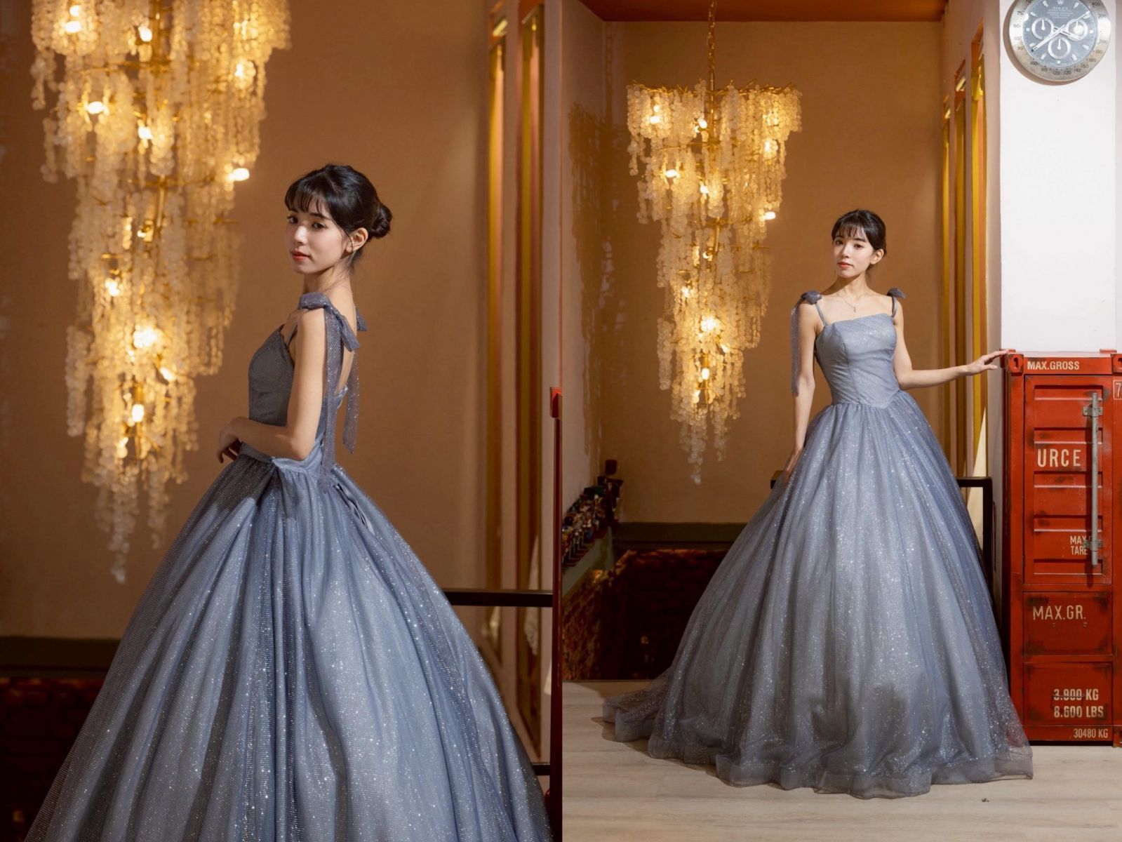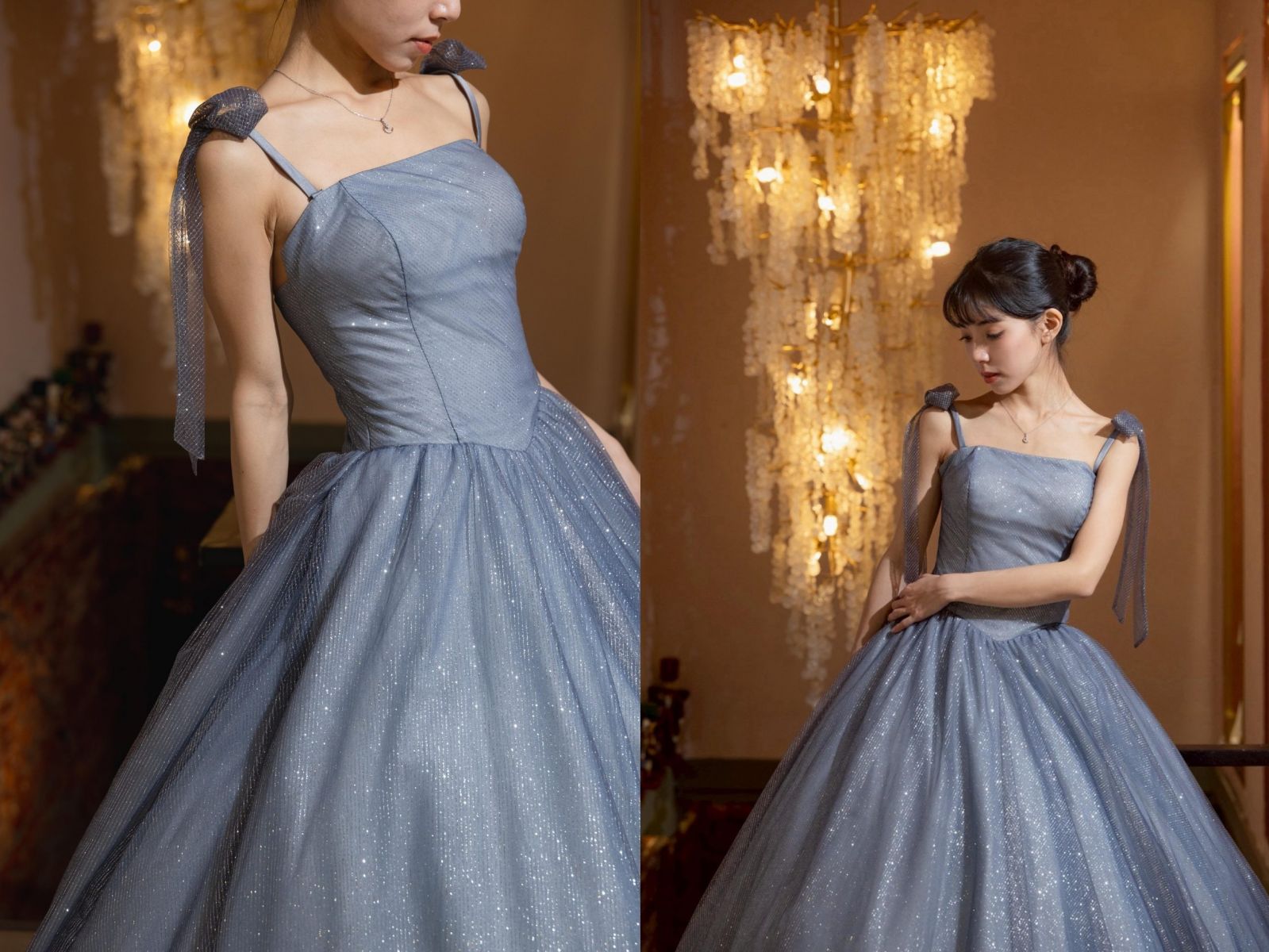 這件莫蘭迪藍色的晚禮服,簡直是氣質兩個字的代名詞。它成功擺脫了「藍色顯黑」的刻板印象,帶來一種清冷的高級感。