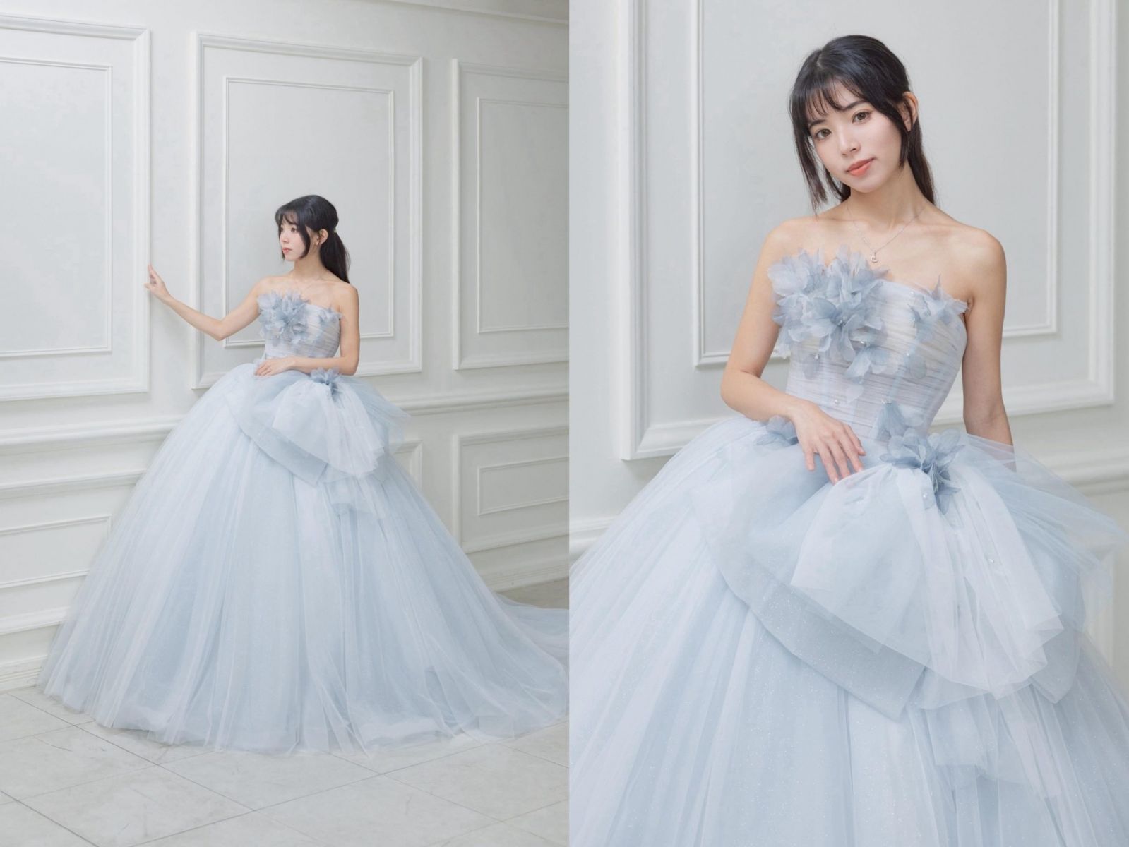 莫蘭迪藍灰調讓禮服散發著內斂又高雅的氣息。我個人非常喜歡她上身的設計,不是單純的平口,而是以交疊的弧形抓皺,巧妙地呈現出類似繃帶纏繞的視覺效果,完美貼合身形,既有層次感又不會過於生硬,營造出一種優雅又充滿設計感的胸型與腰線。胸前和裙身處巧妙地點綴著同色系的立體花飾,這些花朵讓整體多了幾分甜美的感覺。