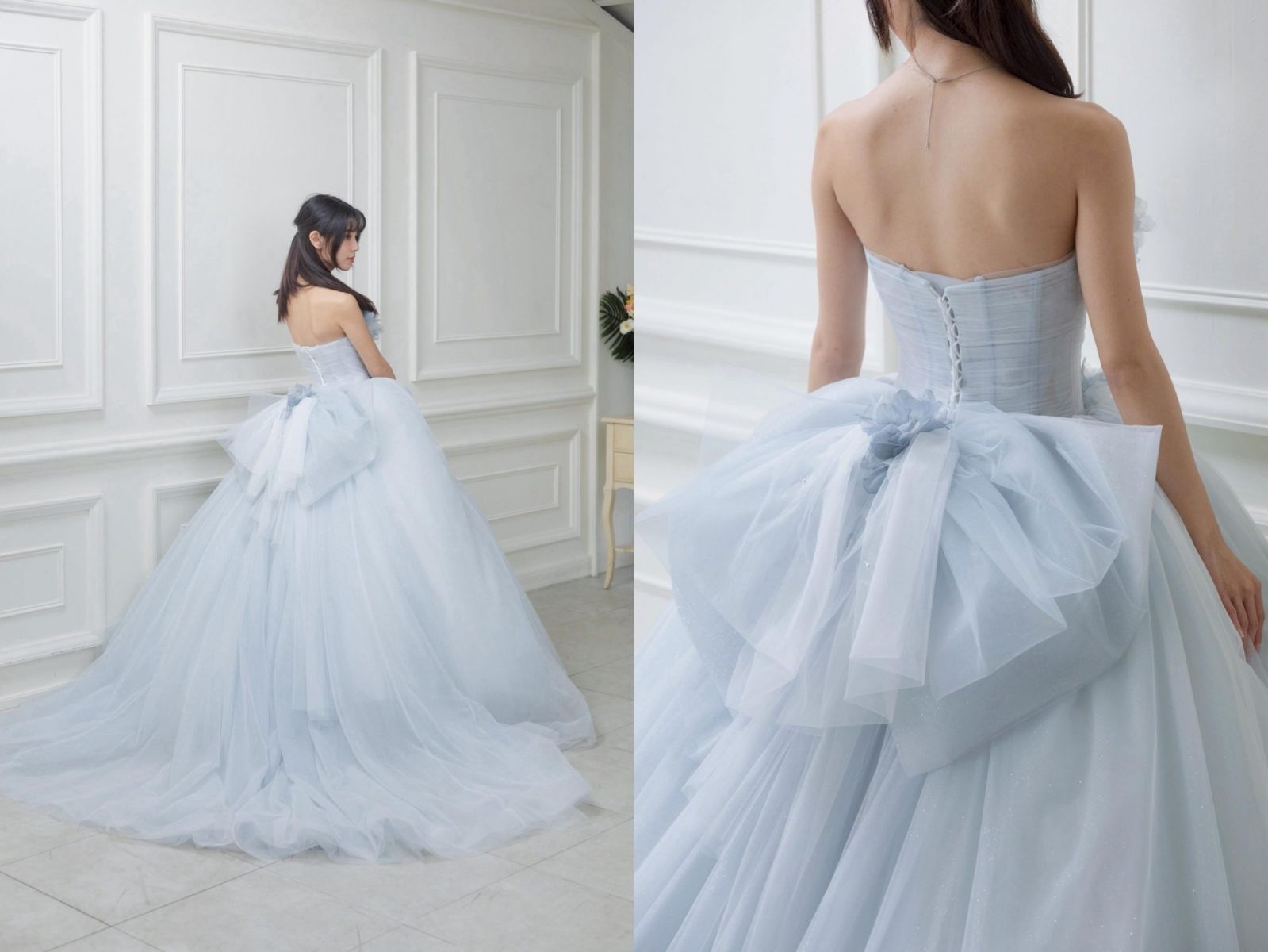 腰部以同色系的緞帶蝴蝶結作為點綴,既收束了腰線,也為整體造型增添了少女般的甜美氣息。無論是嬌小新娘或是想修飾下半身的新娘,都能輕鬆駕馭,打造出修長且夢幻的比例。