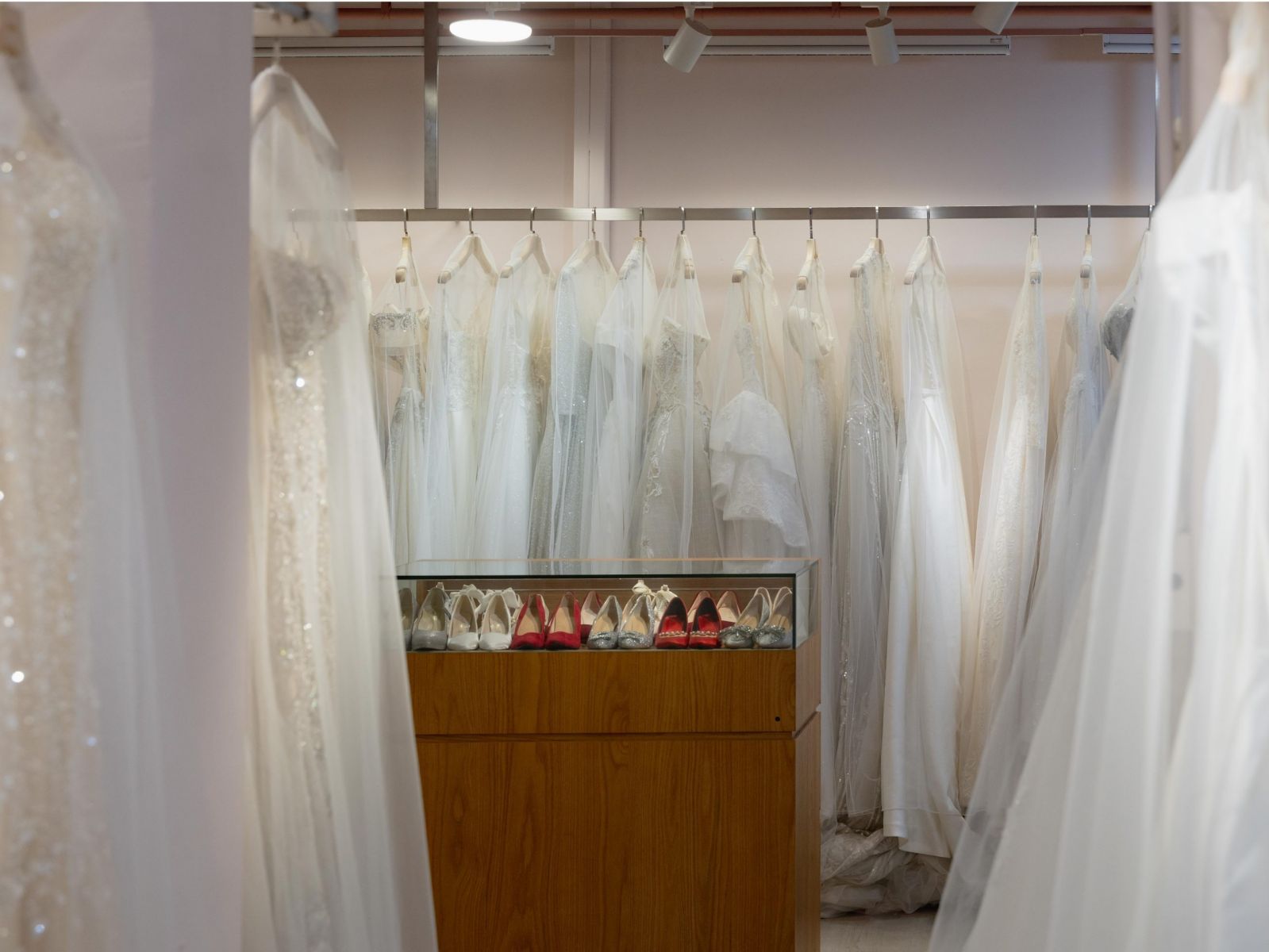 沿著充滿設計感的樓梯拾級而上,就是讓我這個「禮服控」眼睛為之一亮的二樓禮服陳列區。空間規劃得宜,每個區域都分割鮮明,通道寬敞,讓我可以輕鬆自在地穿梭其中,隨意拉起喜歡的禮服細看。這裡的禮服款式真的超級豐富,從典雅的A字裙、浪漫的魚尾裙到豪華的公主裙,各種風格應有盡有。