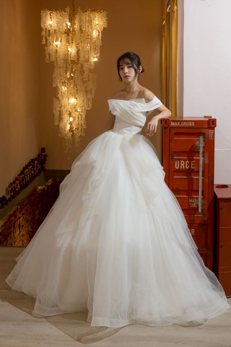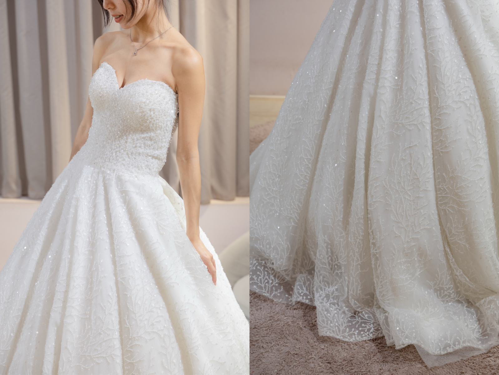 這款婚紗非常適合追求公主夢、渴望在婚禮上成為全場焦點的新娘。其桃心領設計能修飾胸型,讓身形更顯纖細優雅;而蓬裙的設計則能巧妙地修飾臀部與腿部線條,讓新娘自信展現最美的一面。無論是在寬敞的飯店宴會廳,還是戶外的浪漫證婚,這款婚紗都能讓妳宛如童話故事中的公主,步上紅毯的每一步都充滿幸福與光彩。