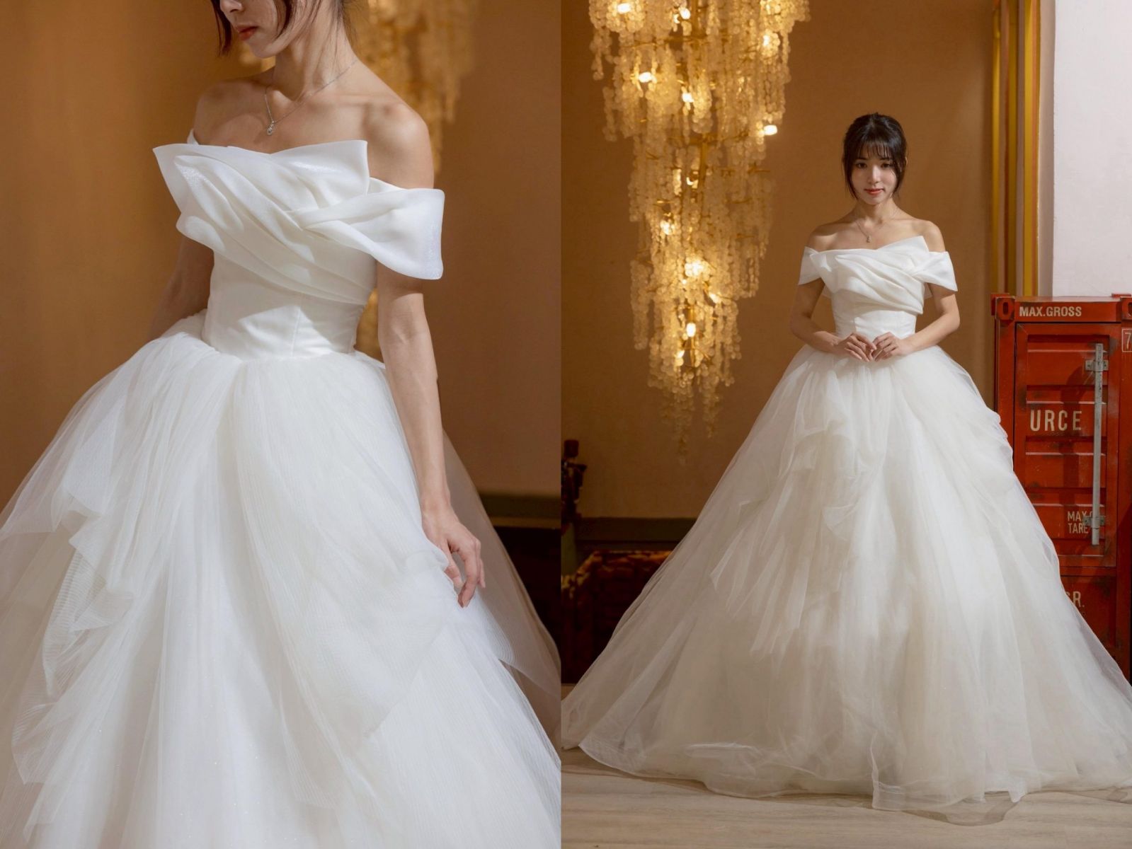 這款婚紗採用優雅的一字領(平肩)設計,但特別的是,它的領口是採用立體、份量感十足的緞面抓皺,完美修飾了手臂線條,自然地柔焦並提升了新娘的肩頸比例。