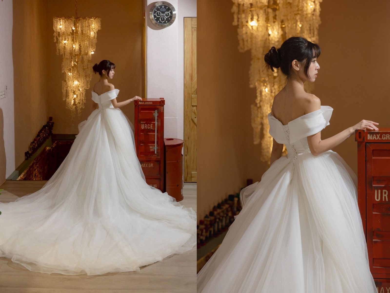 整件婚紗以純白輕紗為主,突出了材質本身柔軟的雲朵層次感。胸前平肩的緞面抓褶細節,為上半身增添了結構與優雅,與下半身輕柔的紗裙形成材質上的對比,更顯高雅大氣。背後採用經典的排釦或綁帶設計,確保婚紗完美貼合身形,展現新娘的背部曲線。