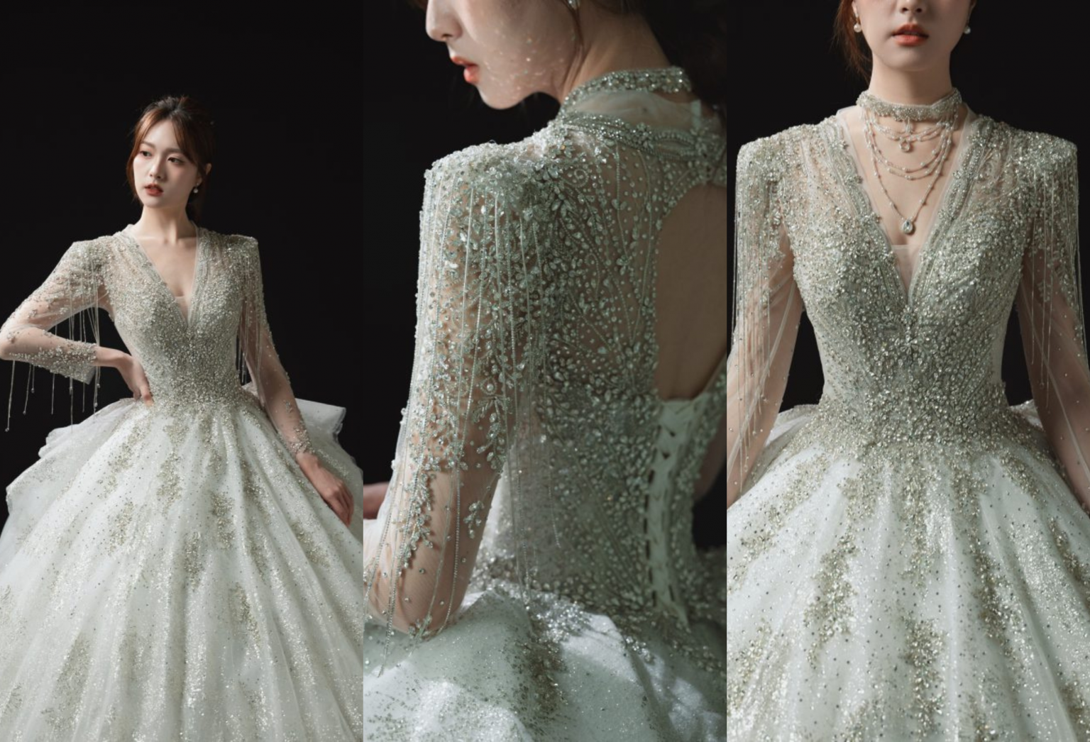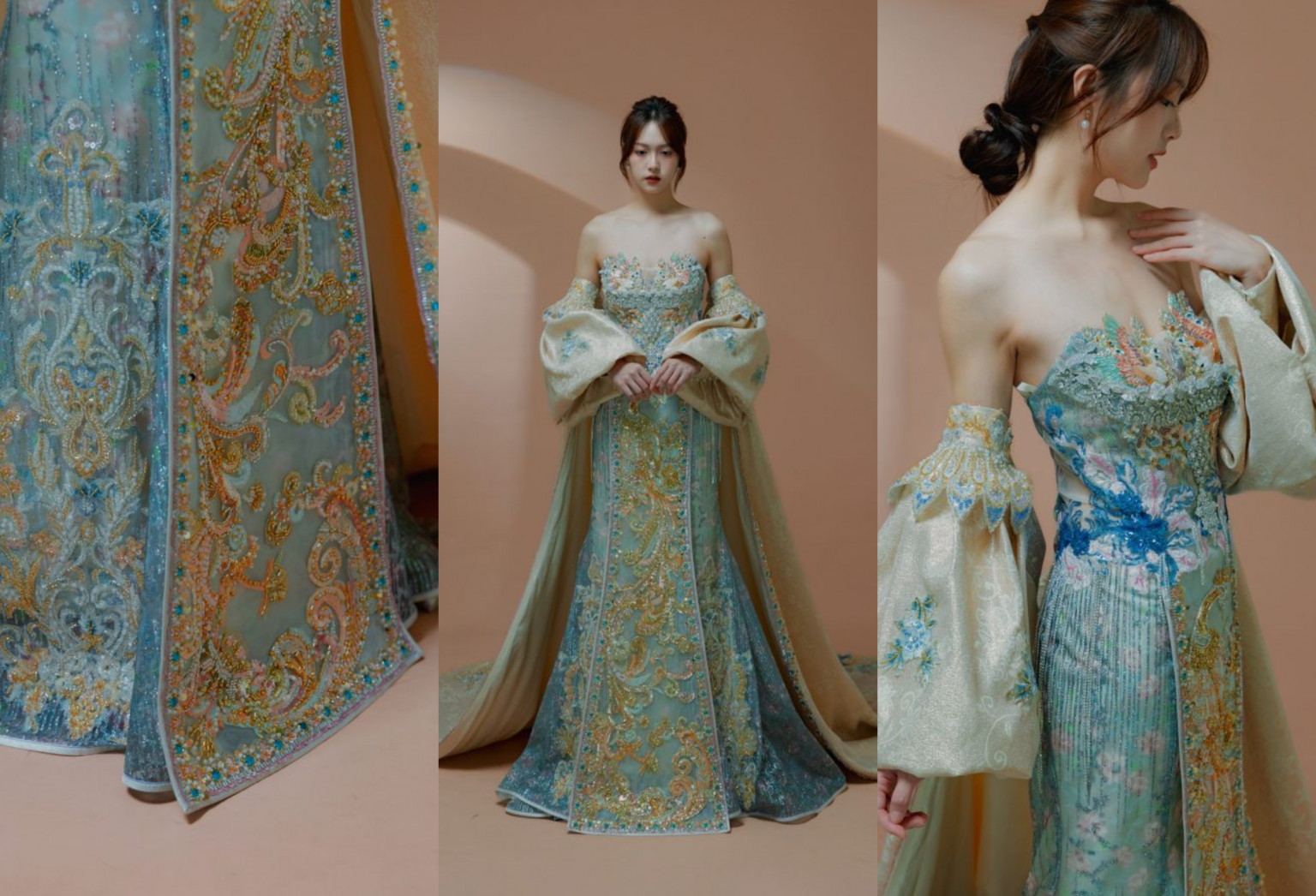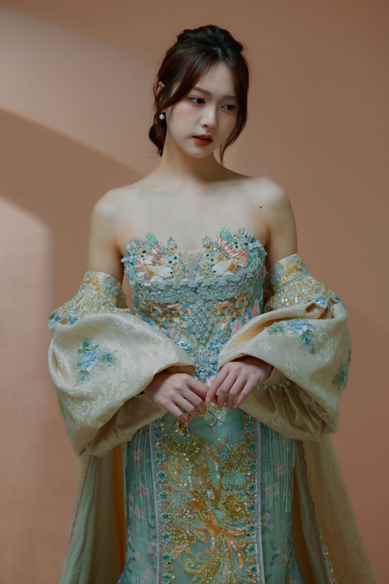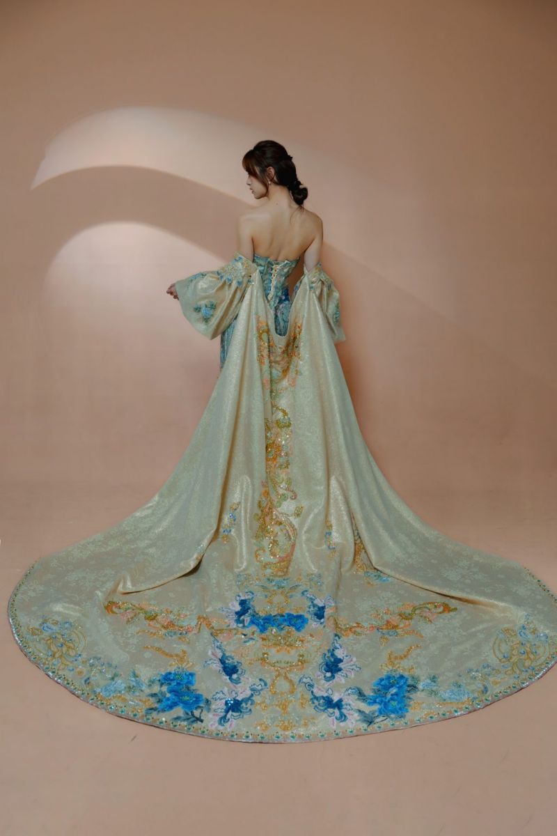 • 布料細節:主體採用淡青綠與香檳金交織的緞面與網紗,並以手工刺繡、珠飾、亮片堆疊出層層光澤,細看每一寸都有精緻工藝感。