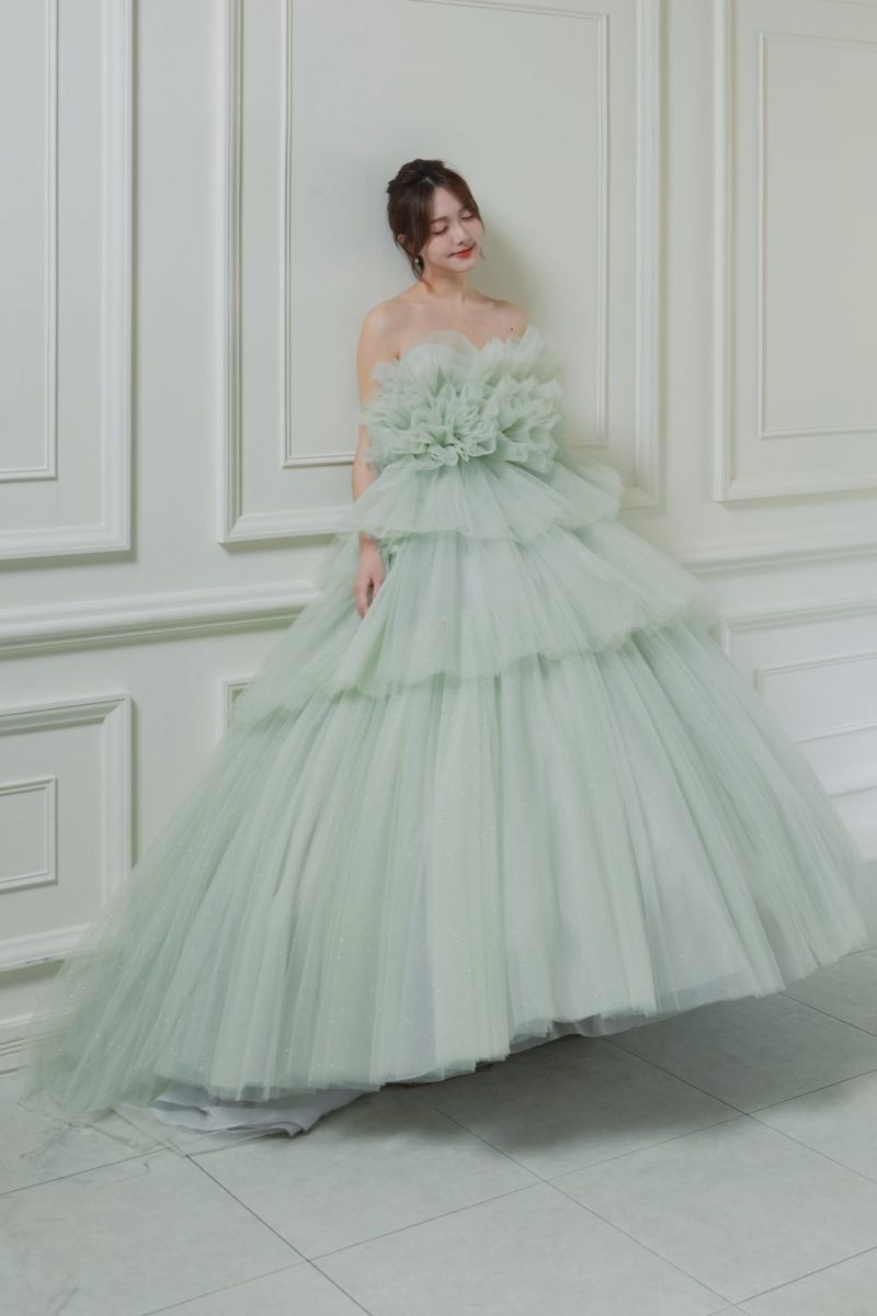 💍 清新精選 — 夢幻薄紗層疊蓬裙,以柔和顯白的薄荷綠色與夢幻蓬紗層次,展現出如仙境般的浪漫氛圍,是一款極具存在感又充滿輕盈感的華麗禮服。