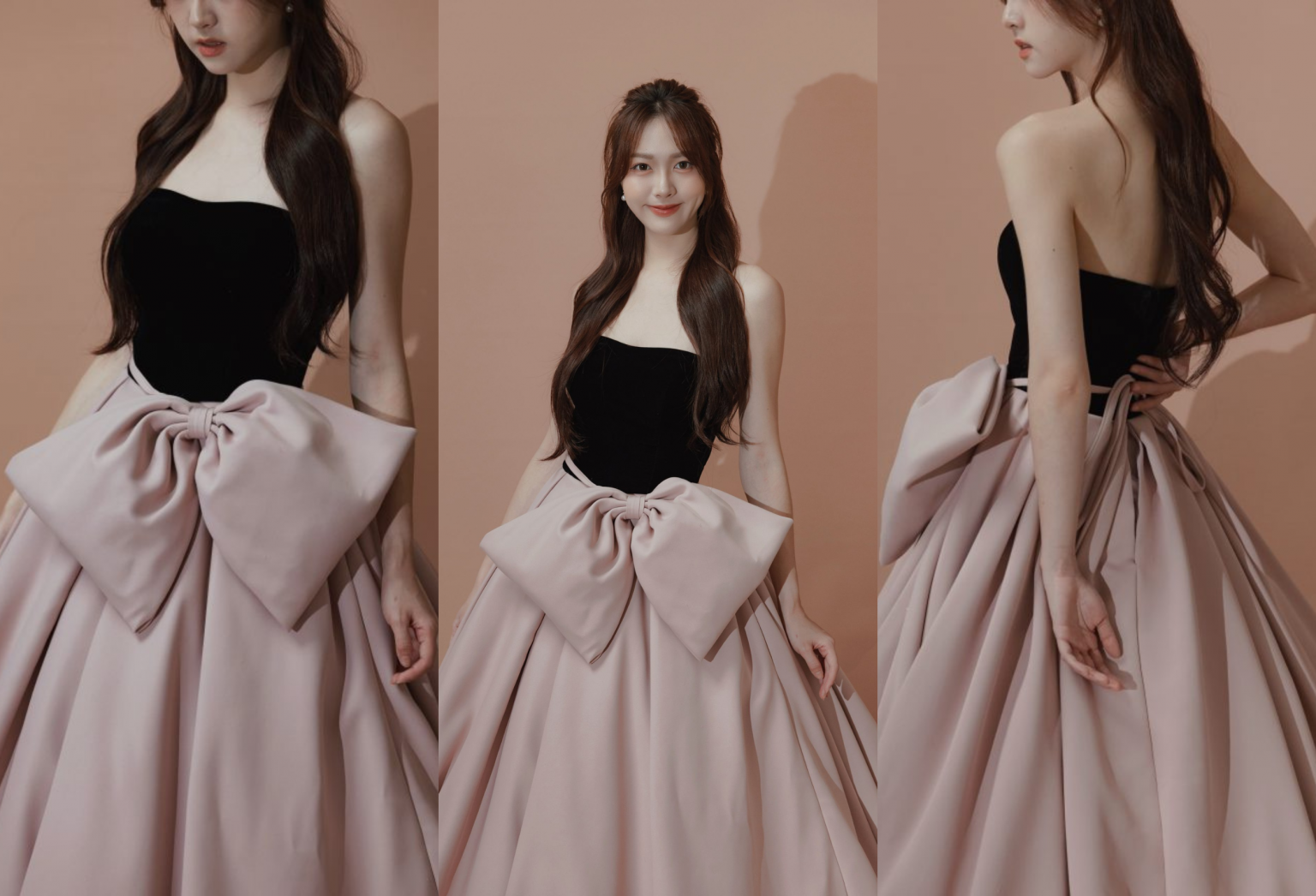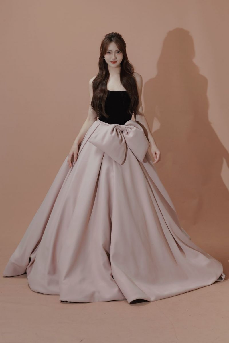 整體給人高貴、成熟又不失浪漫的印象。黑粉配色極具時尚感,跳脫傳統白紗刻板印象,且巨型蝴蝶結設計讓造型更具辨識度與少女感。蓬裙設計穿著時會感覺份量感十足但極具存在感。整體輪廓大器,非常上鏡,在婚禮或拍攝中都能成為焦點。