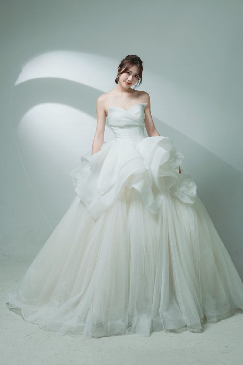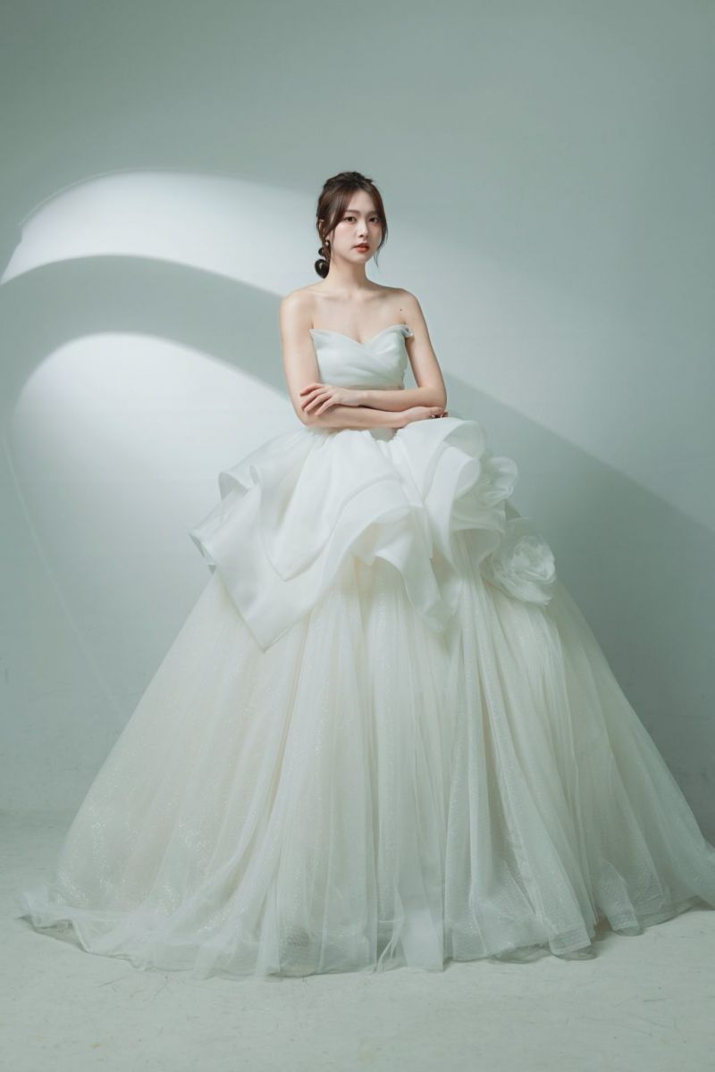 • 整體設計:胸前以大量立體紗花堆疊出如綻放花蕾的造型,視覺焦點集中於上半身。裙擺結構由多層柔霧感薄紗層層堆疊,形成漸層的圓弧蓬度,展現豐盈卻輕盈的公主氣勢。