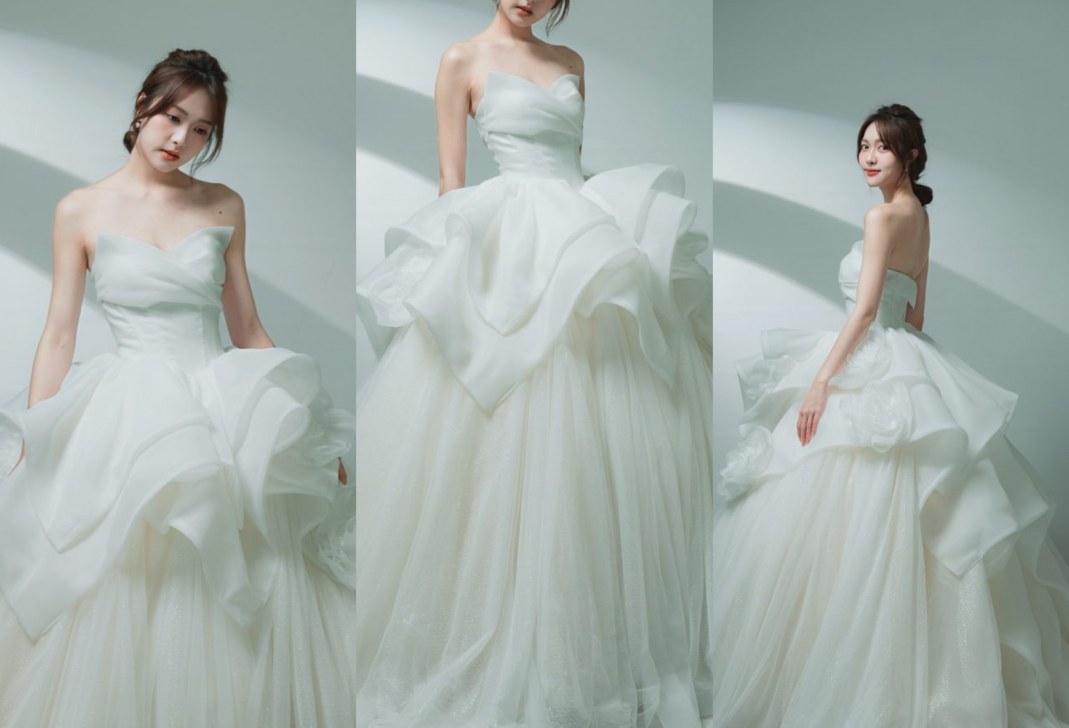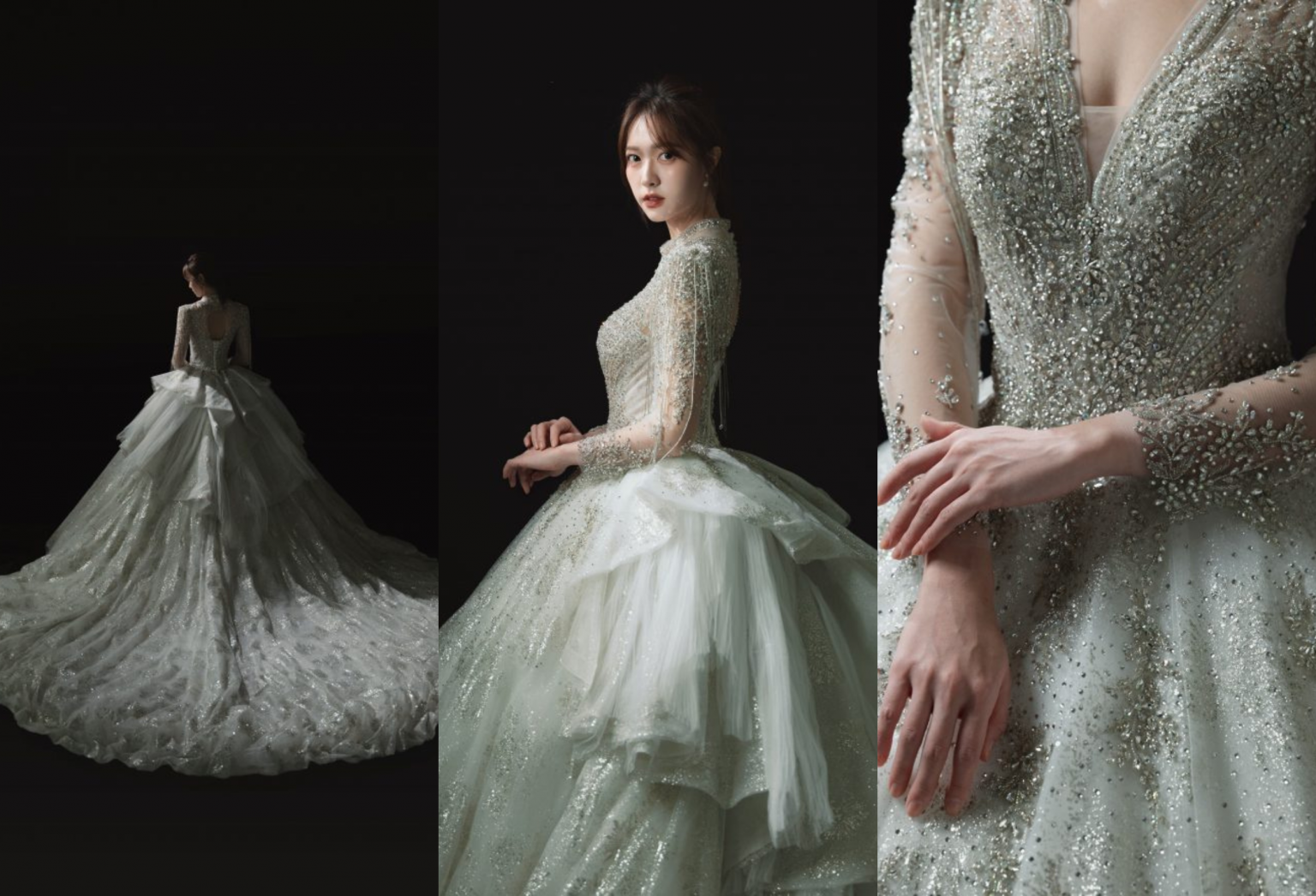 • 色彩運用:以淡薄荷綠為主調,融合微微銀光,是少見且極具辨識度的清新婚紗色系。