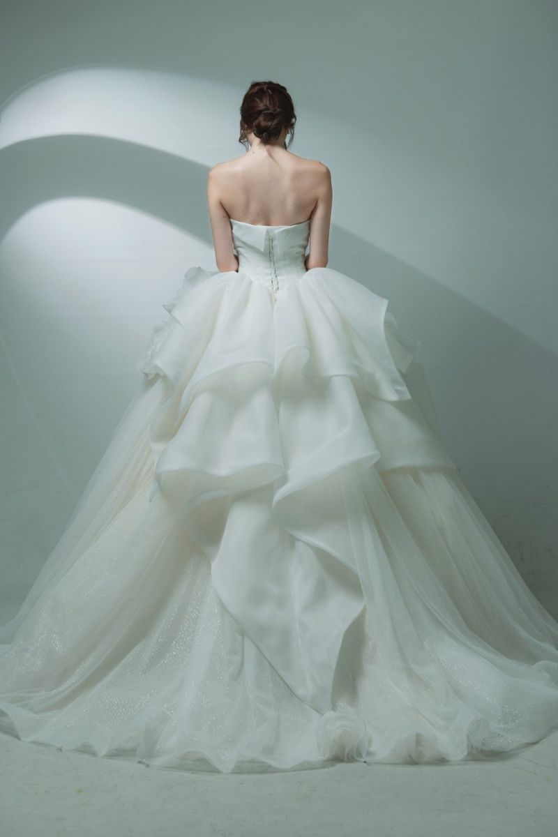 想當氣質的公主就必需選這套婚紗,上身後每一次轉身都閃爍華麗的光芒,真的猶如童話裡的公主登場。輕盈的多層波浪設計讓裙擺豐盈而不呆板,雖然蓬鬆但不顯厚重,穿起來舒適且行動方便。上半身的束腰設計結合心形領口,既性感又高雅。可修飾身形、突顯腰線,營造出纖細的身段。這套真的極具儀式感,非常適合想在婚禮中成為全場焦點、呈現優雅與華麗兼具氣質的新娘。