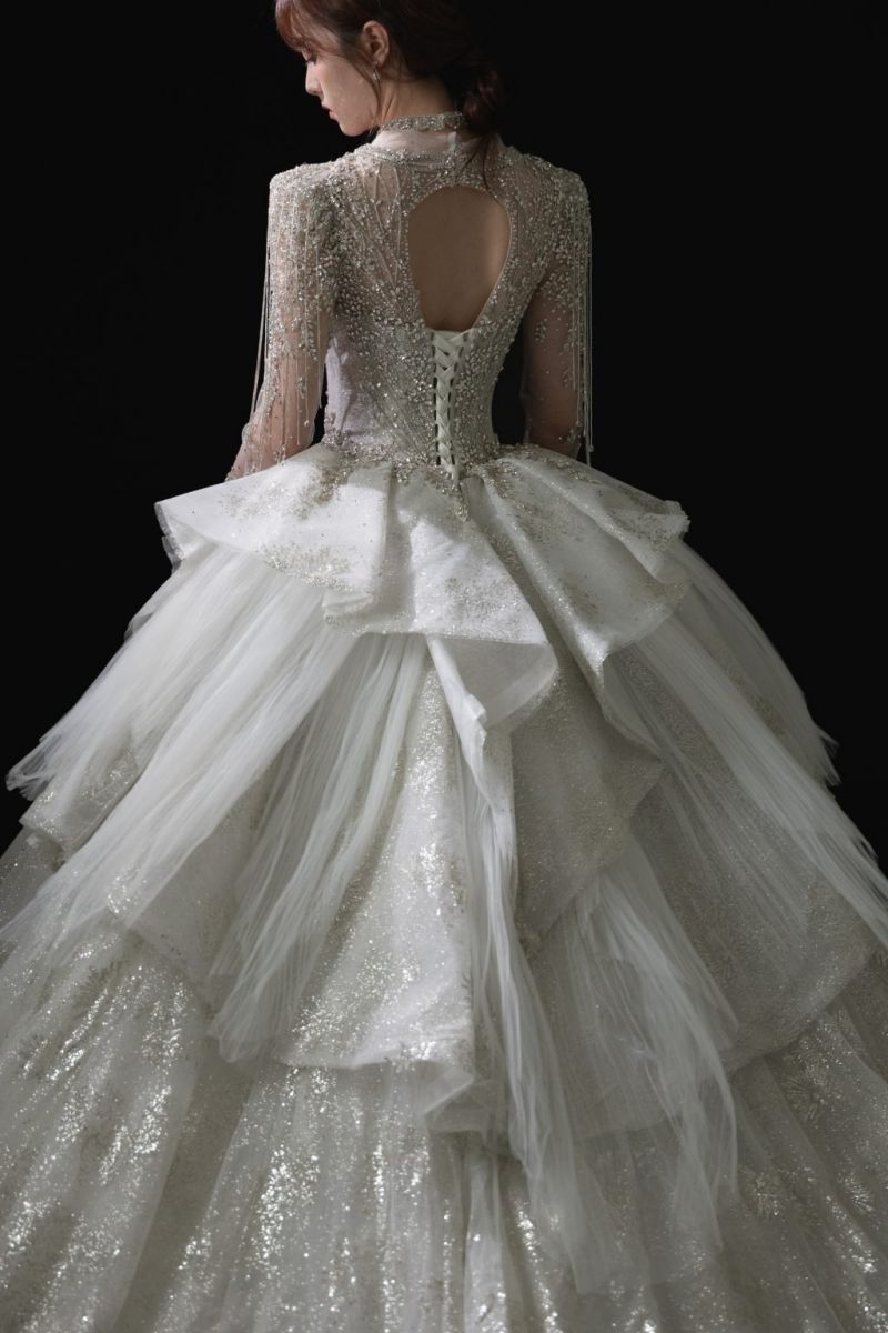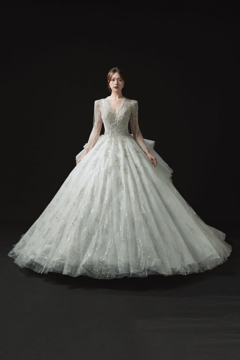 穿上後會有強烈的“被聚光燈照亮”的感覺,全身細緻的亮片與珠繡在光線下折射出細膩的銀白光,就像仙女降臨。裙襬蓬鬆卻不笨重,隨著步伐閃爍華麗的光影。上身深V與立體剪裁的結合,女性魅力與端莊兼具能完美平衡。長袖設計讓整體更具歐風貴族氣息,特別適合氣質型新娘或想呈現女王氣場的人。