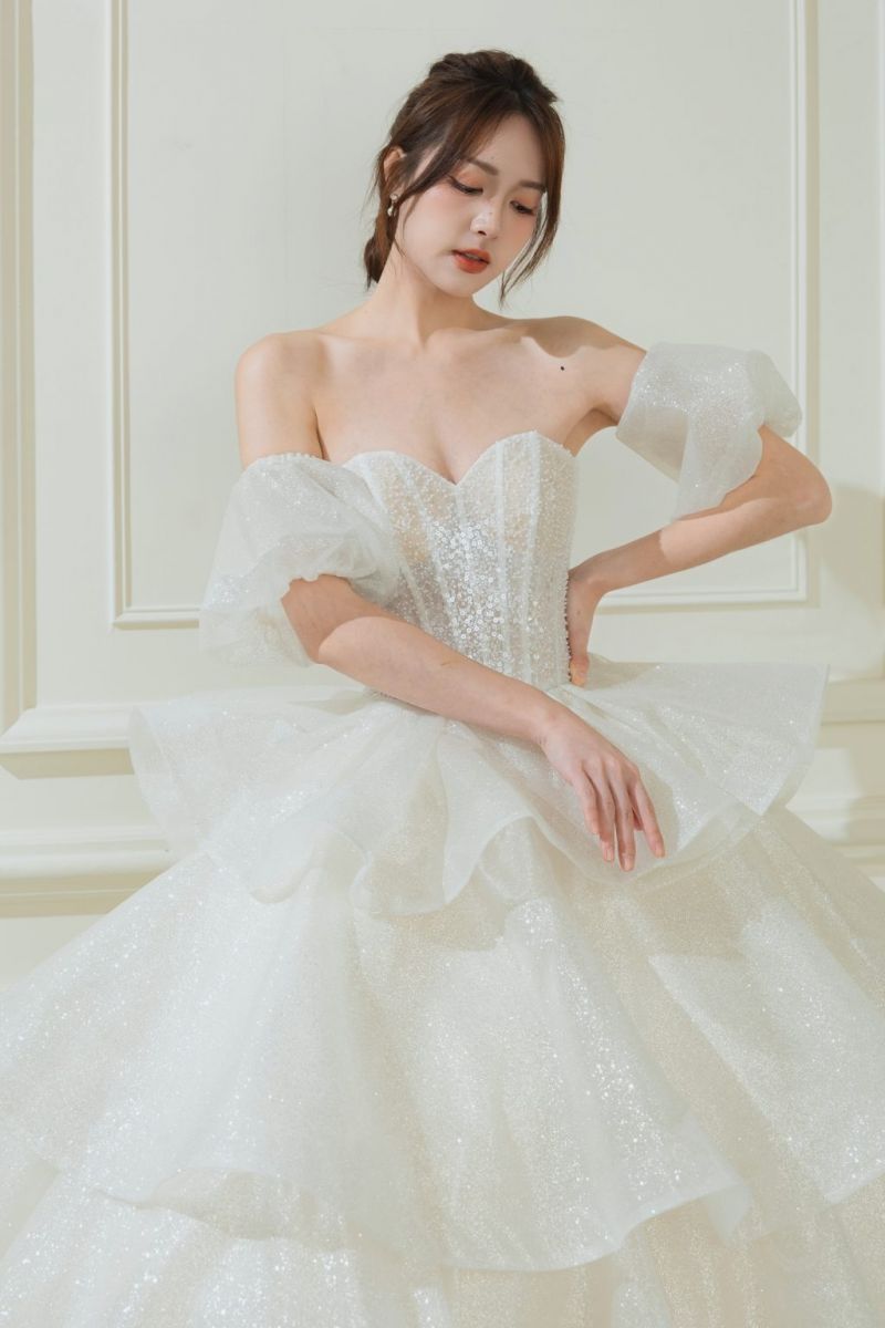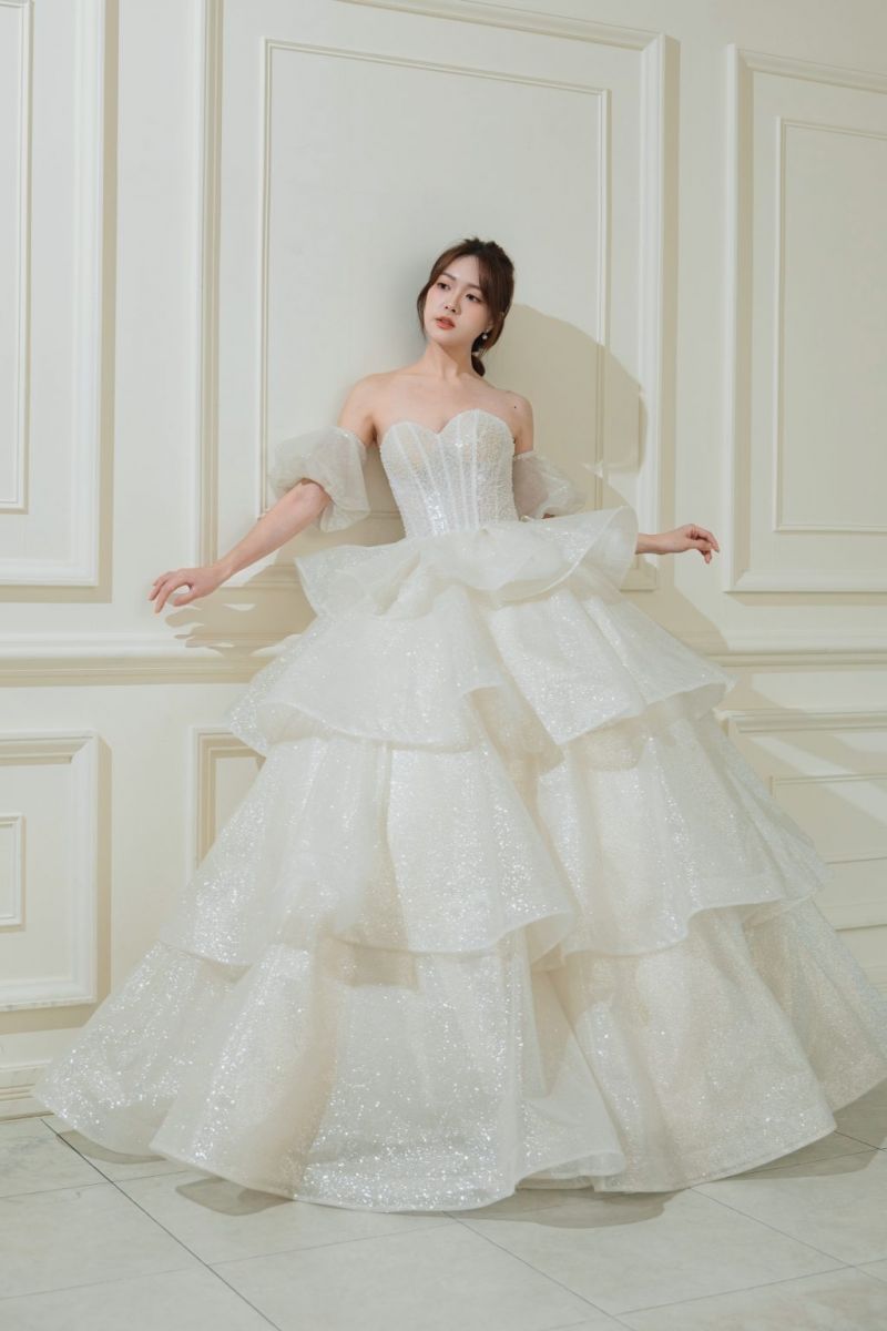 💍 韓式精選 — 這是一款公主式多層蓬裙婚紗,以華麗層疊的裙擺與閃耀面料打造出童話般的浪漫氛圍。